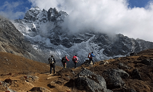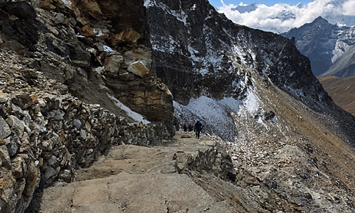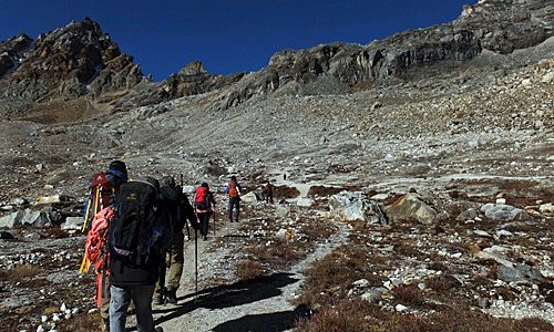 | 後ろから、続々と登ってくる ポーターやトレッカー 8:20頃 どんどん追い越してもらって、マイペースで歩く チョー・オユーの頭がちょっぴり見えた |
