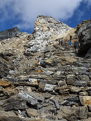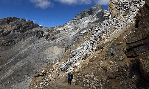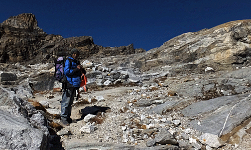 | 私のザックを持って、 前を歩きながら、時々後ろを振り返って 気遣って下さるナーレさん 時々、「ここで休みます」と言って 岩に腰を掛けて数分休み、 また、マイペースで歩き始める |