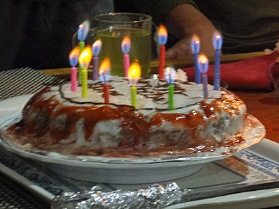 | 食後に、新潟の女性の誕生日を祝って ケーキが出された トレッキングの最終日には、いつもケーキが出るのだが 今日は誕生日ケーキになったようである ローソクは新潟から持参 誕生日メッセージもちゃんと用意されて、 ご主人から奥様へ感謝の言葉があった (浅原さんの企画だって) |