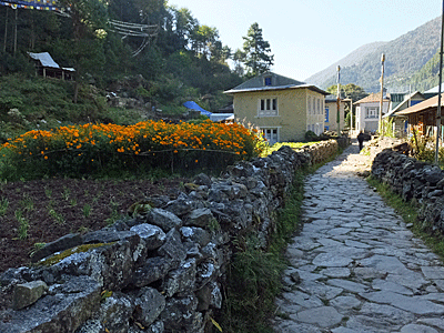 | 石畳の道と、黄色いマリーゴールドのような花 ネパールを訪れた時、空港で歓迎の意味で(多分)、 この花の首飾りを貰うのだが 日本のようには臭くない |