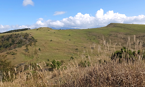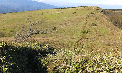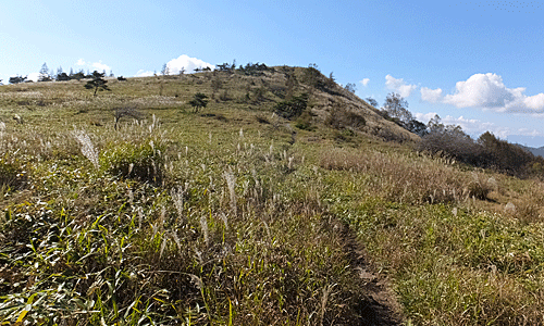 | 前方に。なだらかな稜線 左の小山が「北の耳」 いったん下ってまた小山があるが、「南の耳」 小さな耳だが、そういえば耳に見えるかなあ ・・・といったところ |