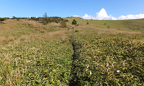 | ストックが笹に絡まったり、 笹で足元の泥ぬる道や段差が見えないので 慎重に足を進める |