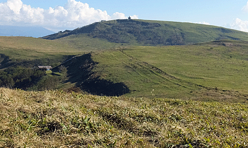 | 中央左の小山が、南の耳 中央にある山の稜線上にあるぽっちりが、 「気象庁の気象レーダー観測所の上にある丸いドーム 遠くからでもよ~く見える ドームの中には、大きなパラボラアンテナがあるって |