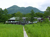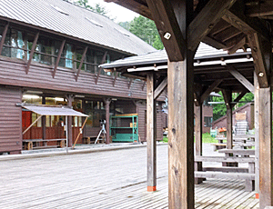 | 尾瀬沼ヒュッテは、 キャンプ場の受付もしている 建物の前に、広い休憩所があった 誰でも休憩できるようだった |