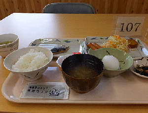 | 朝食は6時から サバの塩焼きは苦手・・・ 「アレルギーなので、手つかずです」と言って返却 |