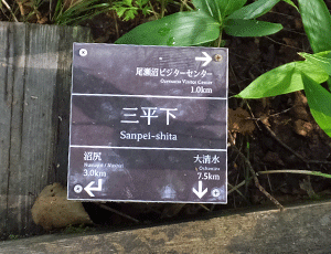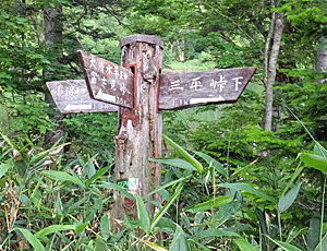 | 「三平下」 7:06 昨日は三平峠から雨に濡れて ここへ下りてきた 今日は直進して、 尾瀬沼のまわりをぐるっと回り込んで 沼尻へ行く予定 |