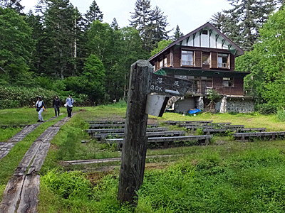 | 山小屋は6軒あった 休憩場所にいい所なので、 ホースから出る水で顔を洗ったり、 ベンチをお借りして行動食をたべた |