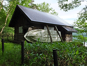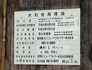 | 7:11 しばらく歩いて行くと、ボートのある小屋があった 無人だった 右 国土交通省の文字が入った標識 「水利使用標識」で、「発電用に水を作ってるよ~」という内容だった |