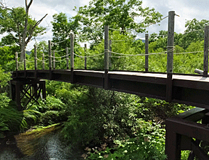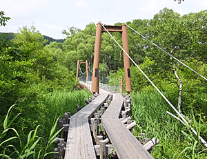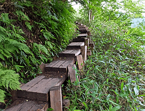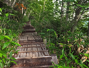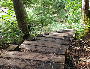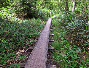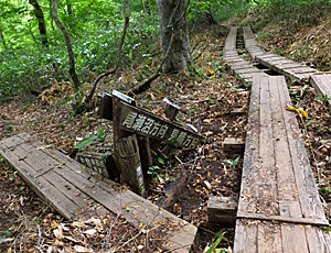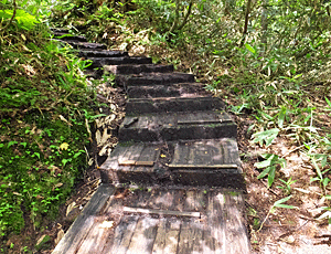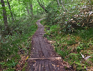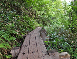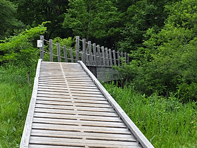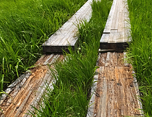 | 古びた木道はこんな感じ もっと古いと、 板が抜けていたり傾いたりはザラ |