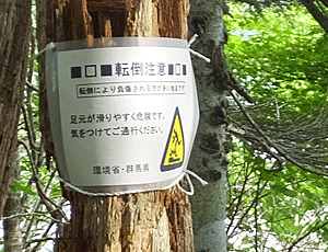 「転倒注意」の張り紙 「転倒により負傷する人が多い場所」らしいが この滑り止めのある木道は、 他の木道に比べてずっと安全だと思う どちらにしろ、濡れた木道には要注意 |