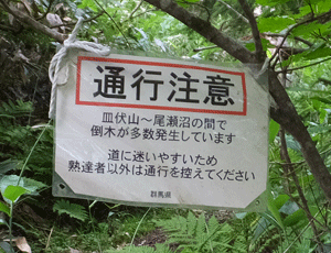 「ツキノワグマ注意」の張り紙 尾瀬沼南岸~沼尻の間 (小沼湿原周辺)で目撃が急増だって 朝方と夕方が多いが、特に夕方が危険らしい |