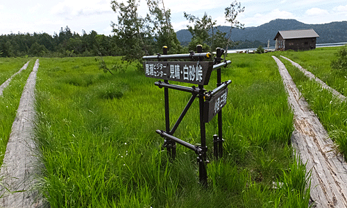 | 尾瀬沼山荘を左手に見て進む 「沼尻まで3km」だって |