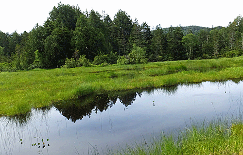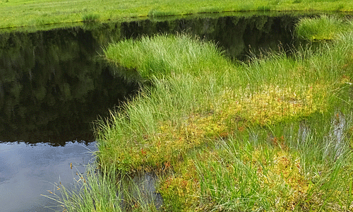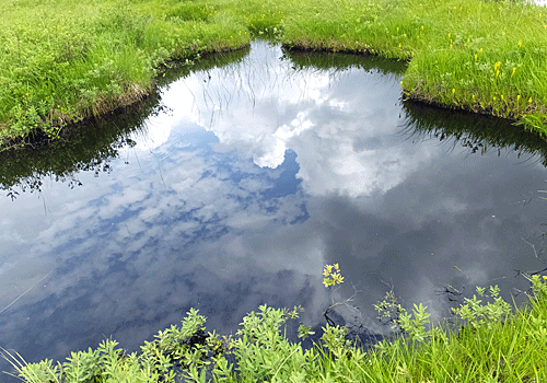 | 大きな池塘の中に島がある 『池塘の中にある島のことを浮島といいます。 池塘の縁が切り離されたり、 底がはがれて浮かび上がったりして作られます。 この浮島は、名前の通り水に浮いていますが、 池塘の底とつながっているものもあります。』だって |