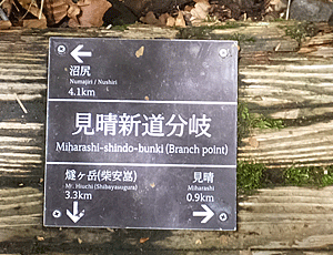 | 同じ場所に標識 「見晴新道分岐」の文字 やっぱり木道に打ち付けてあった |