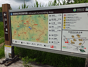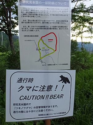 | すぐそばに「尾瀬研究見本園」があり、 熊注意の張り紙があった ・見本園の一部を閉鎖する ・17:00~6:00の間の散策は控えて ・熊鈴の携行や声を出すこと ・・・だって 明日はこの中を少し通ってから見本園を出て 至仏山を目指すことになっている |