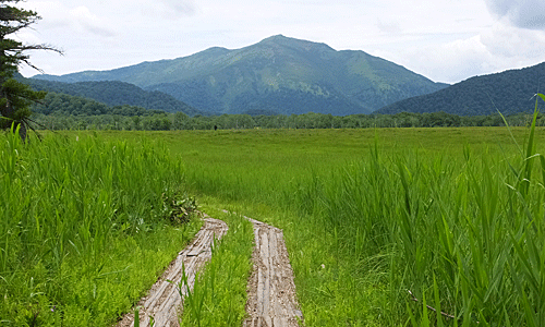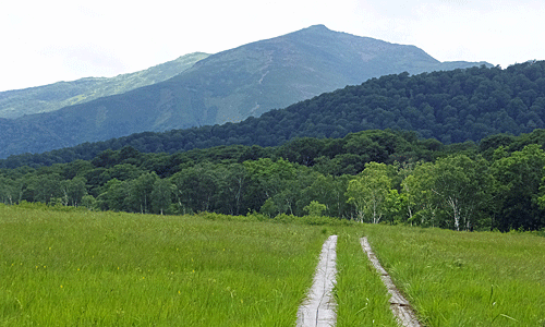 | あの山の形は、至仏山 右側から登り、左側へ下りる 右側からの往復は禁止 |