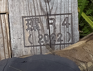 | 左 古い木道と新しい木道のつなぎめ 何年経つと、こんなボロボロになるんだろう? 右 新しい木道についていた文字 R4 (2022)は、令和4年2022年ということだろうね 一昨年の工事だね |