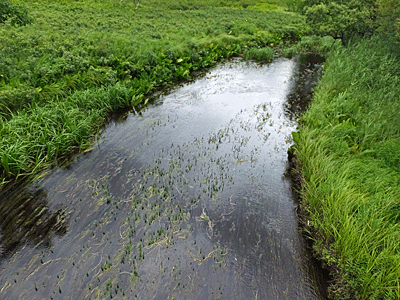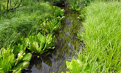 | 湿地の中の水路 ミズバショウが、ずら~っと並んでいた |