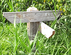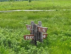 | 木製の指導標は珍しい 11:35 「尾瀬沼方向」と「見晴らし方向」の文字 |