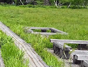 沼尻休憩所は、日向で暑そうだったのでパス 樹林の中は涼しいので 木道に腰を下ろして休憩 |