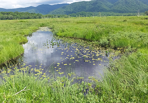![]() 尾瀬ヶ原から 見晴らし十字路の山小屋群を 振り返る ![]() ヒツジグサ |