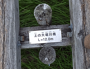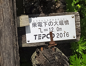 | 東電下の大掘橋(とうでんしものおおほりはし) 左 木道に付けてあった表示版 右 これがその橋 結構川面から高くて、滑りそうで気を付けて渡った |