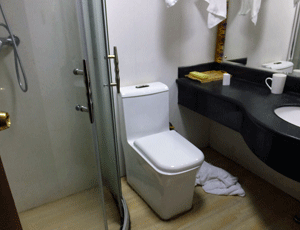 | このホテル 初めてガラス戸付きのシャワー室だったが、 ガラス戸の隙間から水が外へ出て トイレ付近がべたべた バスタオルを足ふき兼床拭きとしたのは 今までと同じ |