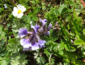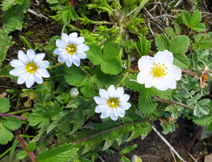 | 左三つはハルリンドウの白花 右は、ノイチゴの仲間:バラ科 |