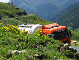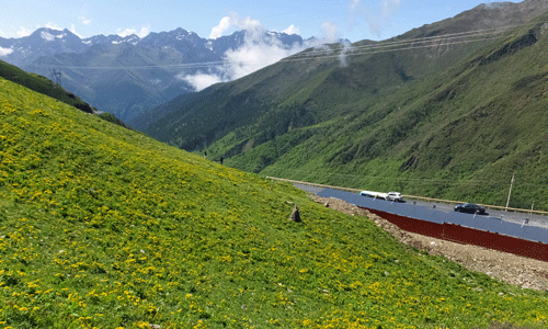 お花畑のすぐ下を 大きなダンプが通り過ぎていく |