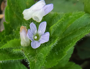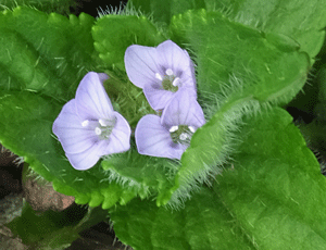 | オオイヌノフグリに似た花:オオバコ科かな? 葉っぱは毛むくじゃら 花が終わると、ぽとりと落ちてしまう |