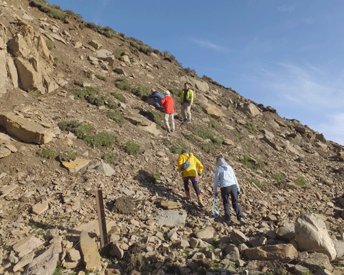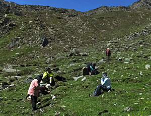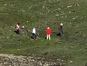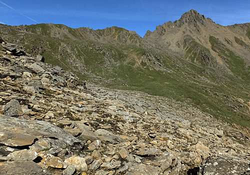 | 先頭グループはガレ場をどんどん進み いったん降りて、次の草地へ 遠くに小さな人影が見える |