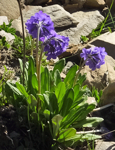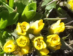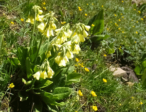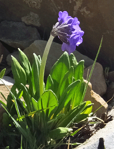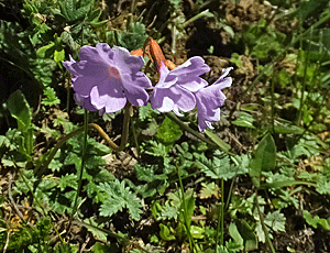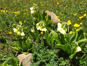 | 上のサクラソウの下に、背の低い白い花 特徴のある葉っぱ 何だろう? |