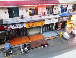 | 3階から見たお店の並んだ通り 06:31 夜の間に ごみはきれいに片づけられていた |
