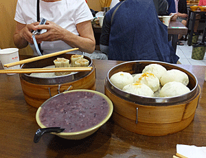 小豆粥風の優しい味だった 丸いものは、肉まん風 |