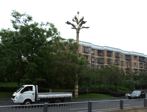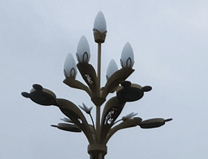 | シャトルバスの中から、なに気なく街灯を見ていたら パンダの顔のような装飾 |