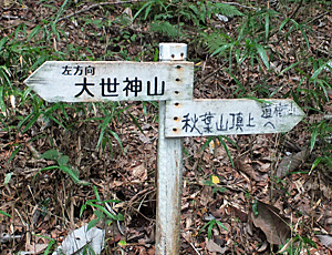 | 道樹山山頂下に、小さな神社がある そこから降りていく途中、こんな標識があった 「大世神山」・・・その小さな神社が「大世神」で 道樹山の別名が「大世神山」?? 右へ行くと道樹山に行けるが、 これまた別名を「秋葉山」というのだろうか? 麓には「秋葉神社」があるので、 秋葉山の名前があるのかも |