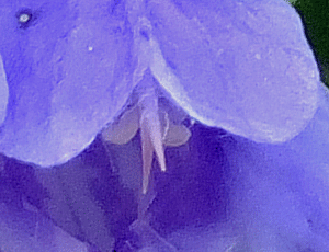 | ラショウモンカズラ:シソ科-2 下唇が大きい・・・シソ科の花の特徴 『下唇は、下方に反り返って、2浅裂し、濃 紫色の模様がある 花冠喉部の先端には開出する長毛が生える』・・・ と説明の通り、長い毛がもじゃもじゃと生えている 下段 ちょっぴり見えているのが雄しべ(白い丸っこい部分)と 雌しべ(とがっている部分で2裂している) |