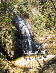 | 【コース】 北小木天王橋傍の集会所(P)9:25〜9:35⇒松尾神社⇒県境の尾根道へ(防火線)⇒八曽山分岐⇒ 八曽山(黒平山)10:50〜11:05⇒八曽の滝(山伏の滝)11:30⇒岩見山12:06〜12:40頃⇒沢に降りる⇒巌頭洞 ⇒キャンプ場⇒亀割駐車場⇒山の神分岐13:42⇒湿地⇒八曽山分岐14:10〜14:20⇒県境の尾根道へ(防火線) ⇒松尾神社14:50頃着⇒集会所(P)15:00頃着 行動時間 約5時間半 |