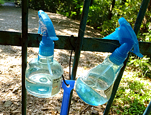 | 駐車場までもうすぐ 途中のゲートの所で、「豚コレラ」感染防止のための消毒剤をスプレーした ↓ 「登山道通行者へのお願い」とあっては、協力しなくっちゃあね! |