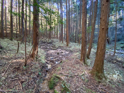 | 沢の脇には増水時の水跡 幾つもの渡渉あり ↓ |