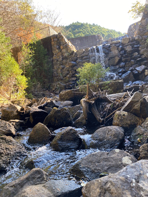 | 堰堤の急な階段を登る |