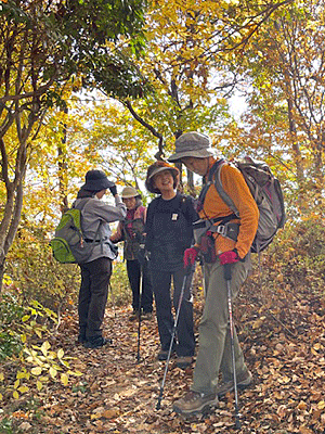 | 赤茶、黄色、緑の葉色に包まれて気持ちも軽やかに歩きます |