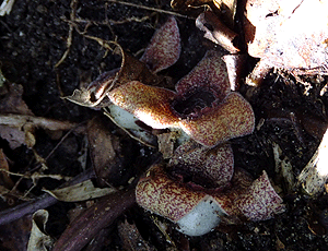 カンアオイ(寒葵)の仲間:ウマノスズクサ科 枯葉をどけ、土を少し掘った |
