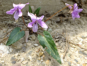 | スミレの仲間:スミレ科 ただのスミレにピンクが入ったよう 側弁(左右に張り出している花弁(花びら)の基部に毛がもじゃもじゃと見える |