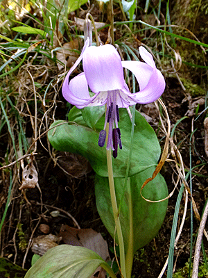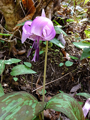 | ↑ つぼみの時は、真下を向いている 『芽を出してから、7〜9年間、1枚の葉の時期を過ごす』とか 2枚葉となってようやく花芽が出てくる』らしい ここのカタクリの葉は、皆、しっかり大きくがっしりしていた |