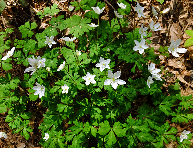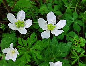 | ニリンソウ(二輪草):キンポウゲ科-2 白い花びらのように見える部分は、萼 ニリンといっても、必ず二輪の花をつけるわけではない 先始めは一輪だけ しばらくすると二輪・たまには三輪になることもある |