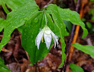 | チゴユリ:イヌサフラン科 雨でぐっしょり 下向きに咲く花が、 いっそう重そうに垂れていた |