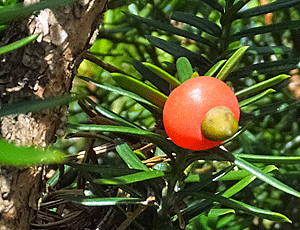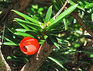 | イチイ(アララギ):イチイ科 『雌雄異株(稀に雌雄同株)』だって ああ、だから実がなっている木が少ないんだね 左 実の中央にある茶色のものは何?? |