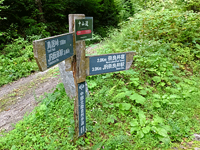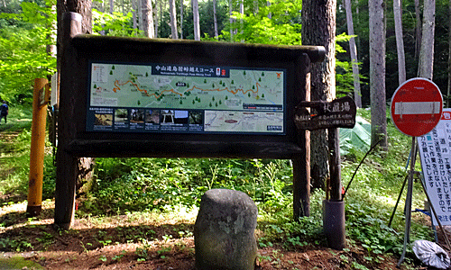 | 林道はここから右へ でも、今は通行禁止 中山道の石畳道は、まっすぐ 後で分かったが 鳥居峠付近の林道が深くえぐられていたので そんな箇所があちこちにあるのかも・・・? |