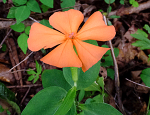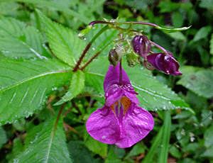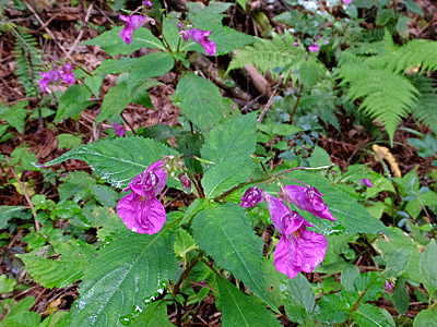 | ツリフネソウ:ツリフネソウ科 これは、葉っぱの上に咲くが、 キツリフネは、葉っぱの下に隠れるように咲く ・・・という違いがある |